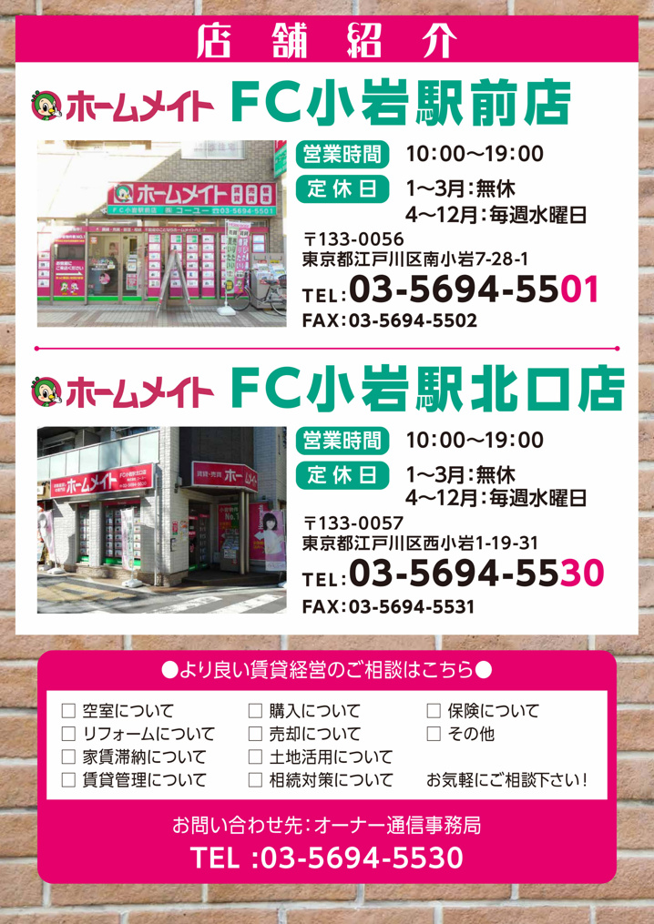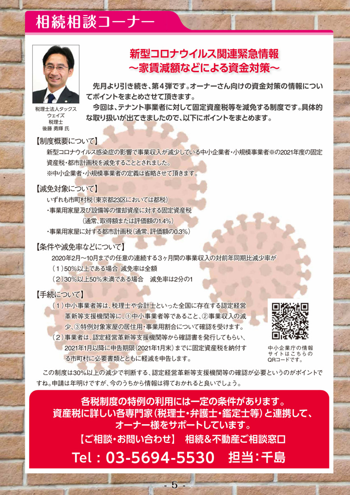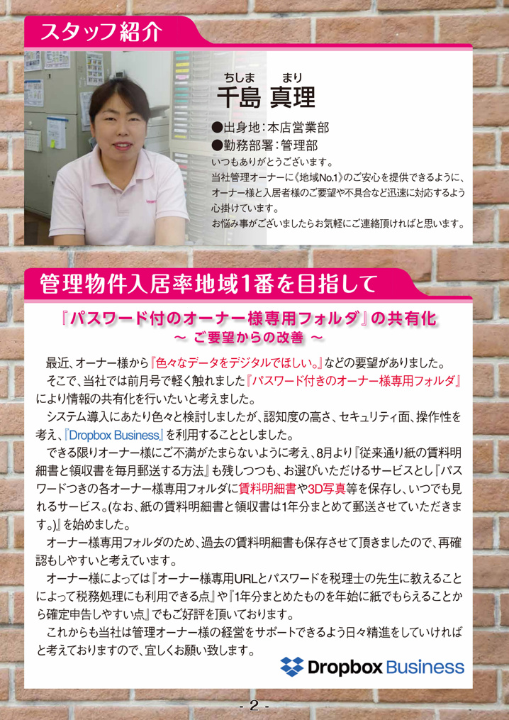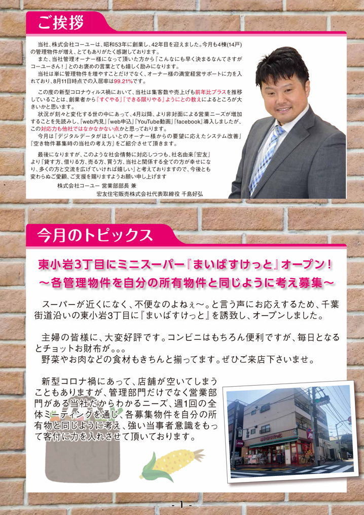 2020年8月号 コーユー通信 2020.09.03 2020年8月号のコーユー通信では"ご要望に迅速対応!色々なデータをデジタルで!""『パスワード付のオーナー様専用フォルダ』の共有化"などをご紹介しております(^∇^) next 大変多くのメールお問い合わせを頂いております。 2020.09.08