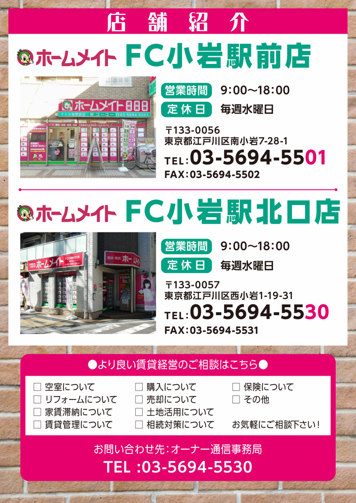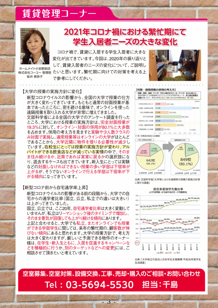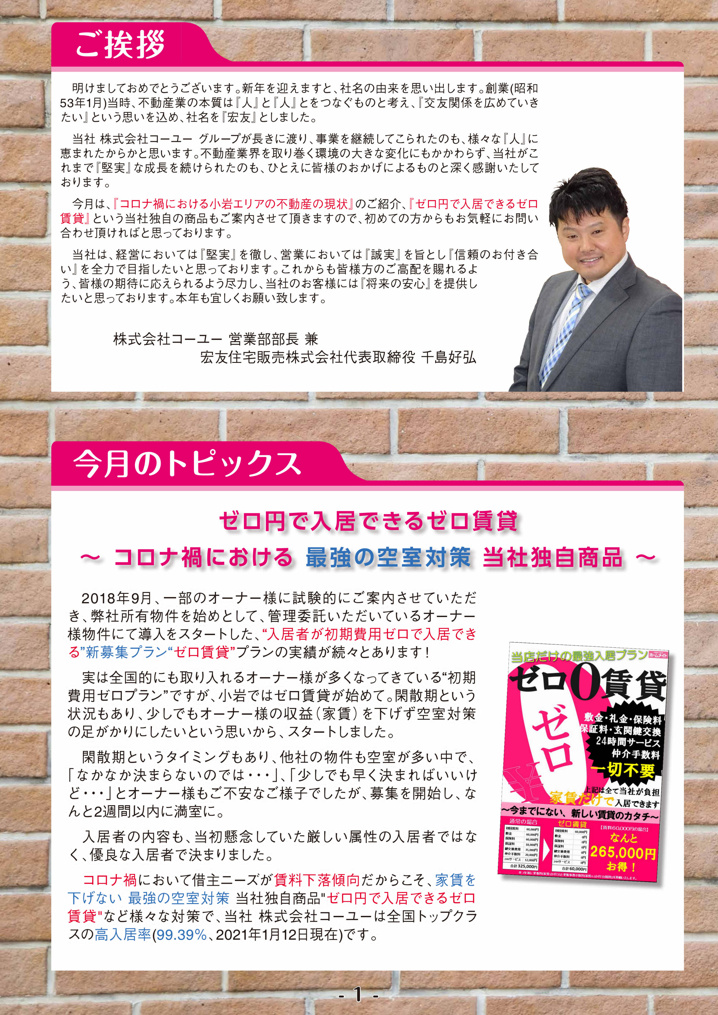 2021年1月号 コーユー通信 2021.02.07 2021年1月号のコーユー通信では最強の空室対策"ゼロ円で入居できるゼロ賃貸""コロナ禍における小岩エリアの不動産の現状"などをご紹介ご紹介しております(^∇^) next 「小岩駅」エリアの落ち着いた魅力と住みやすさとは 2021.02.09